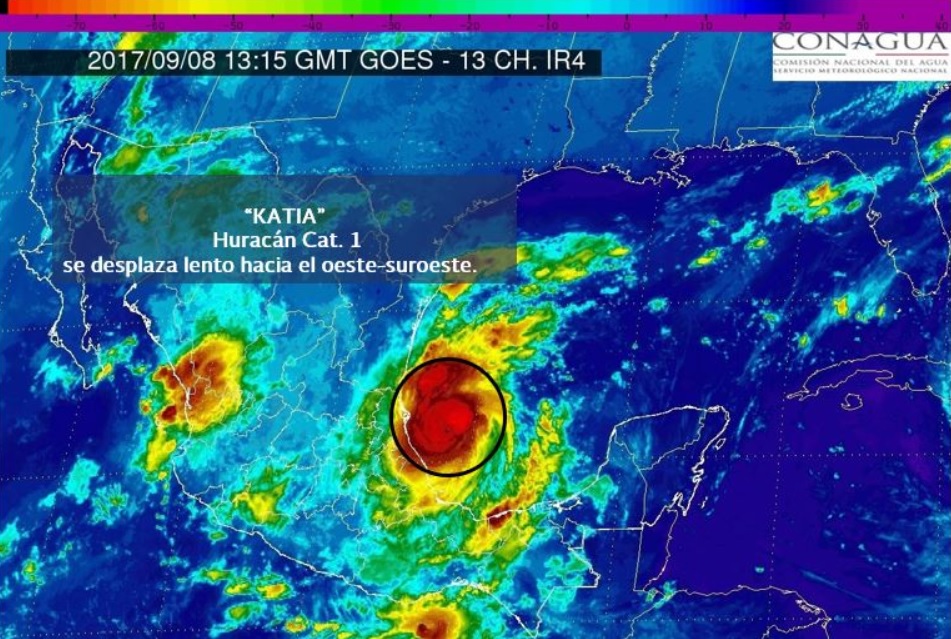 El organismo dependiente de la Comisión Nacional del Agua (Conagua) señaló que un avión cazahuracanes realiza sobrevuelos para determinar el desarrollo de Katia y la intensidad de sus vientos. Precisó que el fenómeno ciclónico se encuentra a 280 kilómetros al nor-noreste de Veracruz, Veracruz; se desplaza al oeste con vientos sostenidos de 140 kilómetros por hora y rachas de 165 kilómetros por hora.