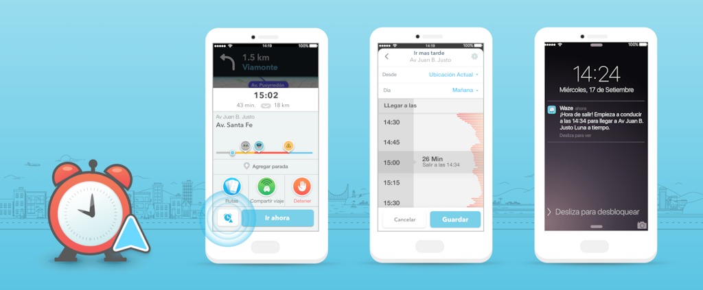 Para que no seas el último amigo en llegar a la reunión o te descuenten de la quincena por llegar siempre tarde a la oficina, Waze presenta su nueva función Planned Drives, con la cual podrás programar una reunión o un viaje importante, ya sea para hoy o la próxima semana. ¡Ahora sabrás en qué momento salir! Sólo escribe la hora y fecha en la que necesitas llegar a tu destino y Waze te recomendará la mejor hora para partir; también recibirás un recordatorio antes de tu evento con una hora de salida basada en las condiciones del tráfico actualizadas en tiempo real.